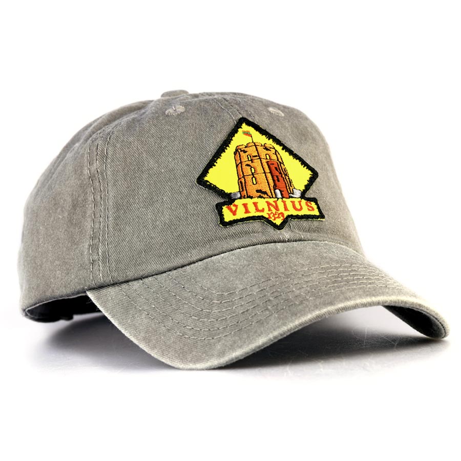 Stilinga pilka „vintage“ stiliaus kepurė su Vilniaus simbolika – Gedimino pilies bokštu. Tai autentiškas suvenyras, primenantis apie Lietuvos sostinės istoriją ir vieną žymiausių miesto simbolių.