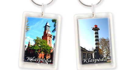 Suvenyras – plastikinis raktų pakabukas su vaizdu iš abieju pusių. Klaipėda: Pašto rūmai ir Klaipėdos švyturys.