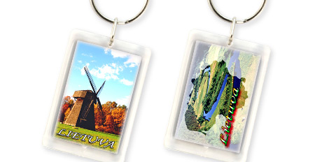 Suvenyras – plastikinis raktų pakabukas su vaizdu iš abieju pusių. Lietuva: Malūnas, Nenumo vingis.