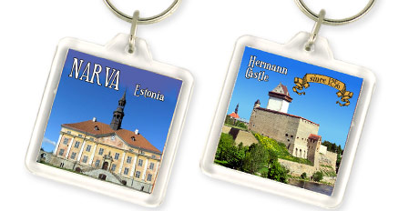 Suvenyras – plastikinis raktų pakabukas su vaizdu iš abieju pusių. Narva.