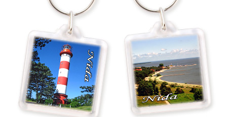 Suvenyras – plastikinis raktų pakabukas su vaizdu iš abieju pusių. Nida: Nidos švyturys