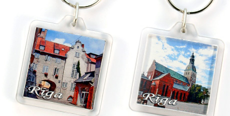 Suvenyras – plastikinis raktų pakabukas su vaizdu iš abieju pusių. Ryga: Švėdų vartai, Domo katedra.