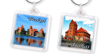 Suvenyras – plastikinis raktų pakabukas su vaizdu iš abieju pusių. Trakai: Trakų salos pilis.