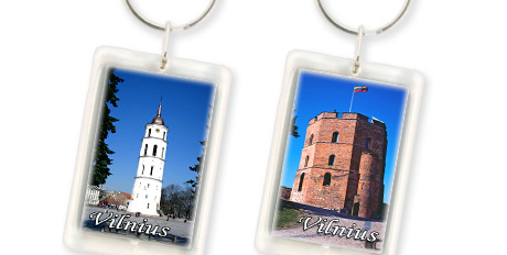 Suvenyras – plastikinis raktų pakabukas su vaizdu iš abieju pusių. Vilnius: Gedimino pilies bokštas, Katedros varpinė.