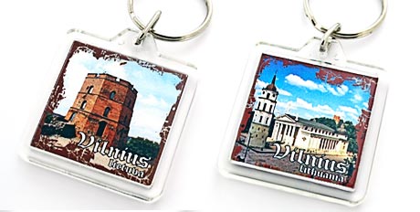 Suvenyras – plastikinis raktų pakabukas su vaizdu iš abieju pusių. Vilnius: Arkikatedra Bazilika ir Varpinė, Gedimino pilies bokštas.