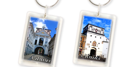 Suvenyras – plastikinis raktų pakabukas su vaizdu iš abieju pusių. Vilnius: Aušros vartai.