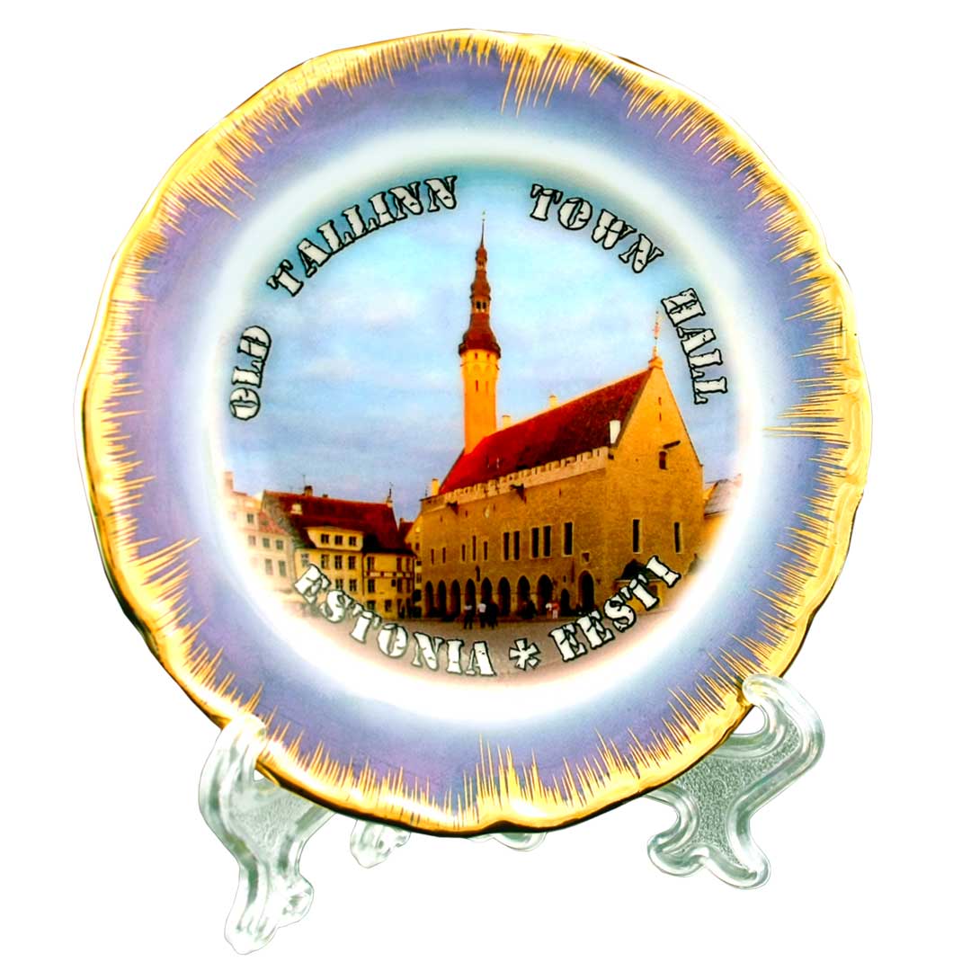 Dekoratyvinė porcelianinė suvenyrinė lėkštelė su Talino rotušės (Old Tallinn Town Hall) atvaizdu – išskirtinis suvenyras Estija. Ši elegantiška 11 cm skersmens lėkštelė dekoruota auksu, subtiliai pereinančiais į alyvinį foną, o jos centre – vienas žymiausių Talino senamiesčio pastatų.