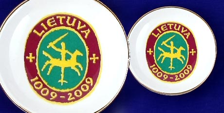 Suvenyras – porcelianinė lėkštutė magnetas su spalvotu Lietuvos tūkstantmečio ženklu. Lėkštutė papuošta auksine juostele.