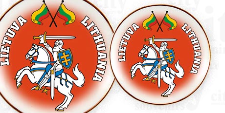 Suvenyras – porcelianinė lėkštutė magnetas Lietuva – Vytis spalvota. Lėkštutė papuošta auksine juostele.