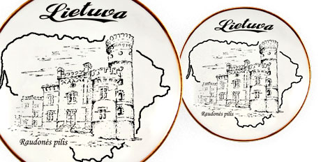 Suvenyras – porcelianinė lėkštutė magnetas Raudonės pilis. Lėkštutė papuošta auksine juostele.