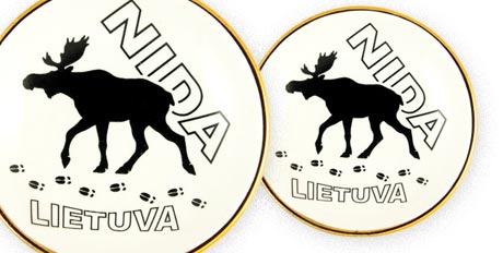 Suvenyras – porcelianinė lėkštutė magnetas Nida – Briedis. Lėkštutė papuošta auksine juostele.
