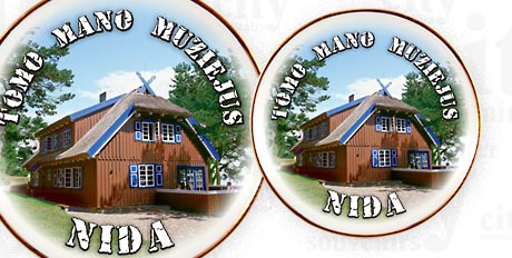 Suvenyras – porcelianinė lėkštutė magnetas Tomo Mano Namas, Nida. Lėkštutė papuošta auksine juostele.