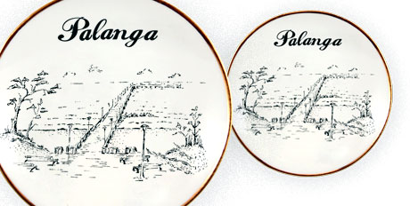 Suvenyras – porcelianinė lėkštutė magnetas Palangos tiltas. Lėkštutė papuošta auksine juostele.