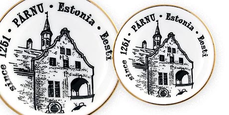 Suvenyras – porcelianinė lėkštutė magnetas Parnu. Lėkštutė papuošta auksine juostele.