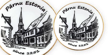 Suvenyras – porcelianinė lėkštutė magnetas Parnu. Lėkštutė papuošta auksine juostele.