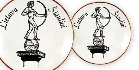 Suvenyras – porcelianinė lėkštutė magnetas Šiauliai – Auksinis berniukas. Lėkštutė papuošta auksine juostele.