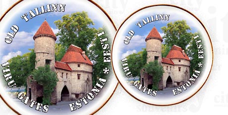 Suvenyras – porcelianinė lėkštutė magnetas Vyrų vartai, Talinas. Lėkštutė papuošta auksine juostele.