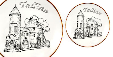 Suvenyras – porcelianinė lėkštutė magnetas Vyrų vartai, Talinas. Lėkštutė papuošta auksine juostele.