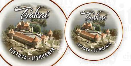 Suvenyras – porcelianinė lėkštutė magnetas Trakų salos pilis. Lėkštutė papuošta auksine juostele.