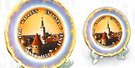 Suvenyras – dekoruota porceliano lėkštutė su mėlynu krašteliu ir padengta auksu. Viduryje lėkštutės paveikslėlis su miesto vaizdu. Lėkštutė su stoveliu ir kabliuku pakabinimui ant sienos.