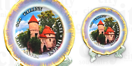 Suvenyras – dekoruota porceliano lėkštutė su mėlynu krašteliu ir padengta auksu. Viduryje lėkštutės paveikslėlis su miesto vaizdu. Lėkštutė su stoveliu ir kabliuku pakabinimui ant sienos.
