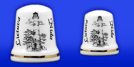 Suvenyras – porcelianinis antpirštis Nidos švyturys. Antpirštis papuoštas auksine juostele, supakuotas skaidrioje plastikinėje dėžutėje.