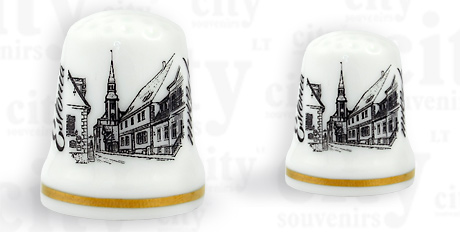 Suvenyras – porcelianinis antpirštis Parnu. Antpirštis papuoštas auksine juostele, supakuotas skaidrioje plastikinėje dėžutėje.