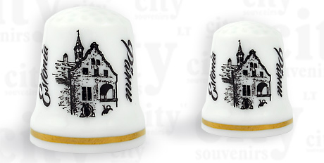 Suvenyras – porcelianinis antpirštis Parnu. Antpirštis papuoštas auksine juostele, supakuotas skaidrioje plastikinėje dėžutėje.