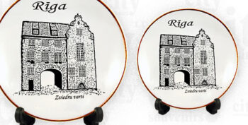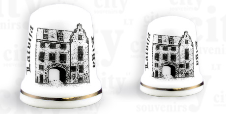 Suvenyras – porcelianinis antpirštis Ryga Švėdų vartai. Antpirštis papuoštas auksine juostele, supakuotas skaidrioje plastikinėje dėžutėje.