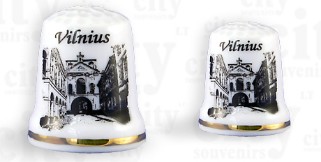Suvenyras – porcelianinis antpirštis Aušros vartai, Vilnius. Antpirštis papuoštas auksine juostele, supakuotas skaidrioje plastikinėje dėžutėje.