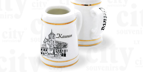 Suvenyras – porcelianinis bokaliukas Arkikatedra, Kaunas. Bokaliukas papuoštas auksinėmis juostelėmis, supakuotas skaidrioje plastikinėje dėžutėje.