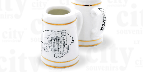 Suvenyras – porcelianinis bokaliukas Lietuva – Raudonės pilis. Bokaliukas papuoštas auksinėmis juostelėmis, supakuotas skaidrioje plastikinėje dėžutėje.