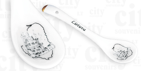 Suvenyras – porcelianinis šaukštelis Lietuva Raudonės pilis. Šaukštelis dekoruotas auksu, supakuotas skaidrioje plastikinėje dėžutėje.