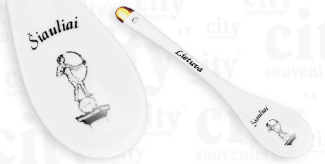 Suvenyras – porcelianinis šaukštelis Šiauliai – Auksinis berniukas. Šaukštelis dekoruotas auksu, supakuotas skaidrioje plastikinėje dėžutėje.