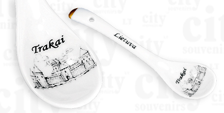 Suvenyras – porcelianinis šaukštelis Trakų salos pilis. Šaukštelis dekoruotas auksu, supakuotas skaidrioje plastikinėje dėžutėje.