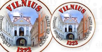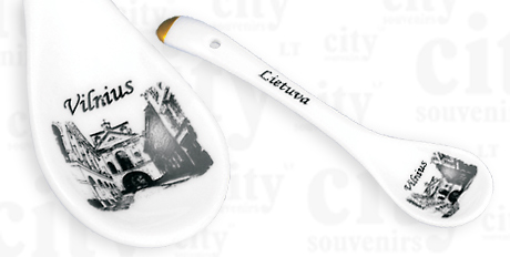 Suvenyras – porcelianinis šaukštelis Aušros vartai, Vilnius. Šaukštelis dekoruotas auksu, supakuotas skaidrioje plastikinėje dėžutėje.