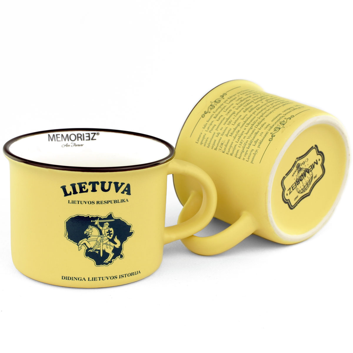 Pastelinės spalvos keramikinis puodelis su Vyčiu ir Lietuvos istorijos motyvais. Kompaktiškas, stilingas ir supakuotas dovanų dėžutėje.