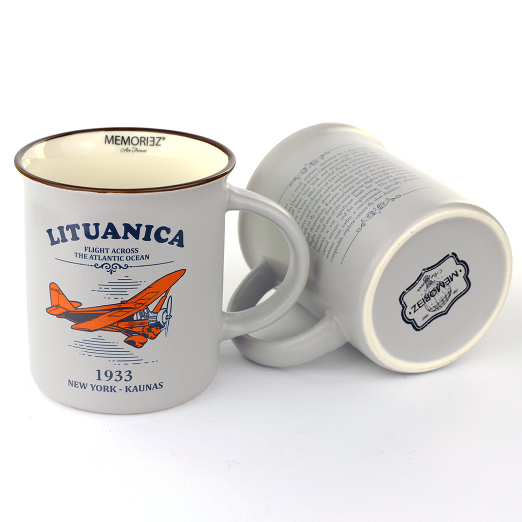 Puodelio priekinėje pusėje pavaizduotas lėktuvas Lituanica bei užrašai: