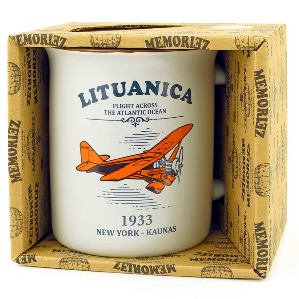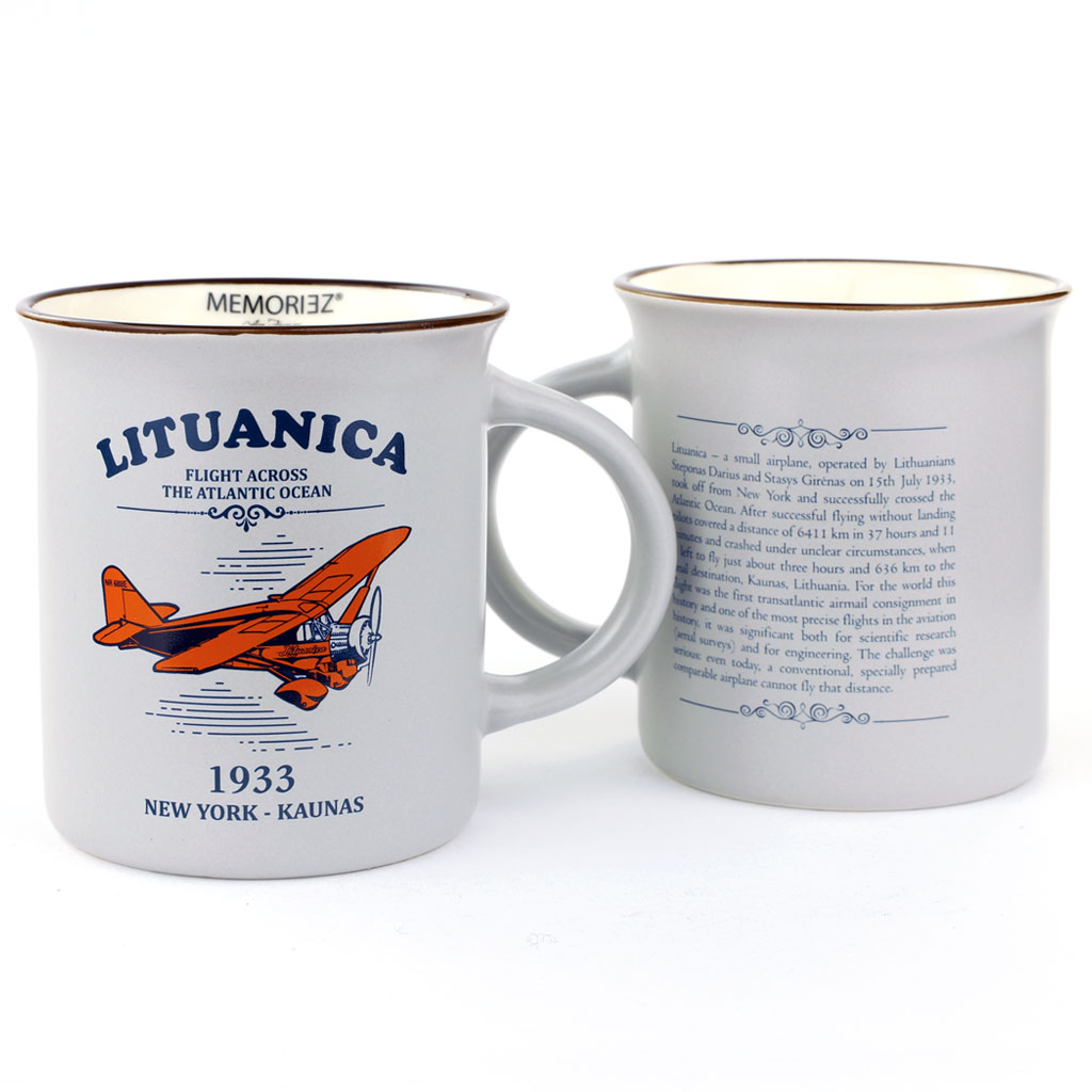 Pilkas 280 ml puodelis „Lituanica 1933“ su anglų kalbos istoriniu tekstu. Supakuotas originalioje dėžutėje.