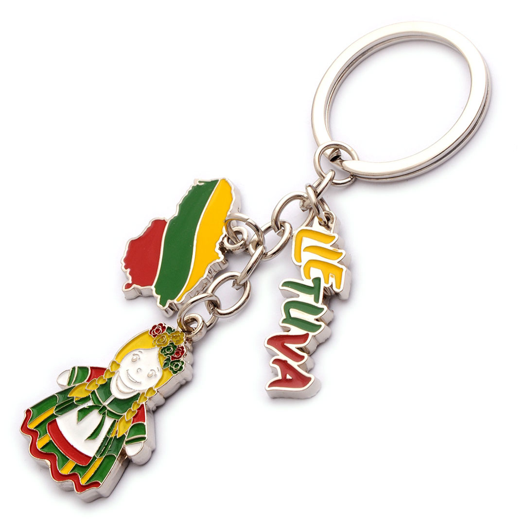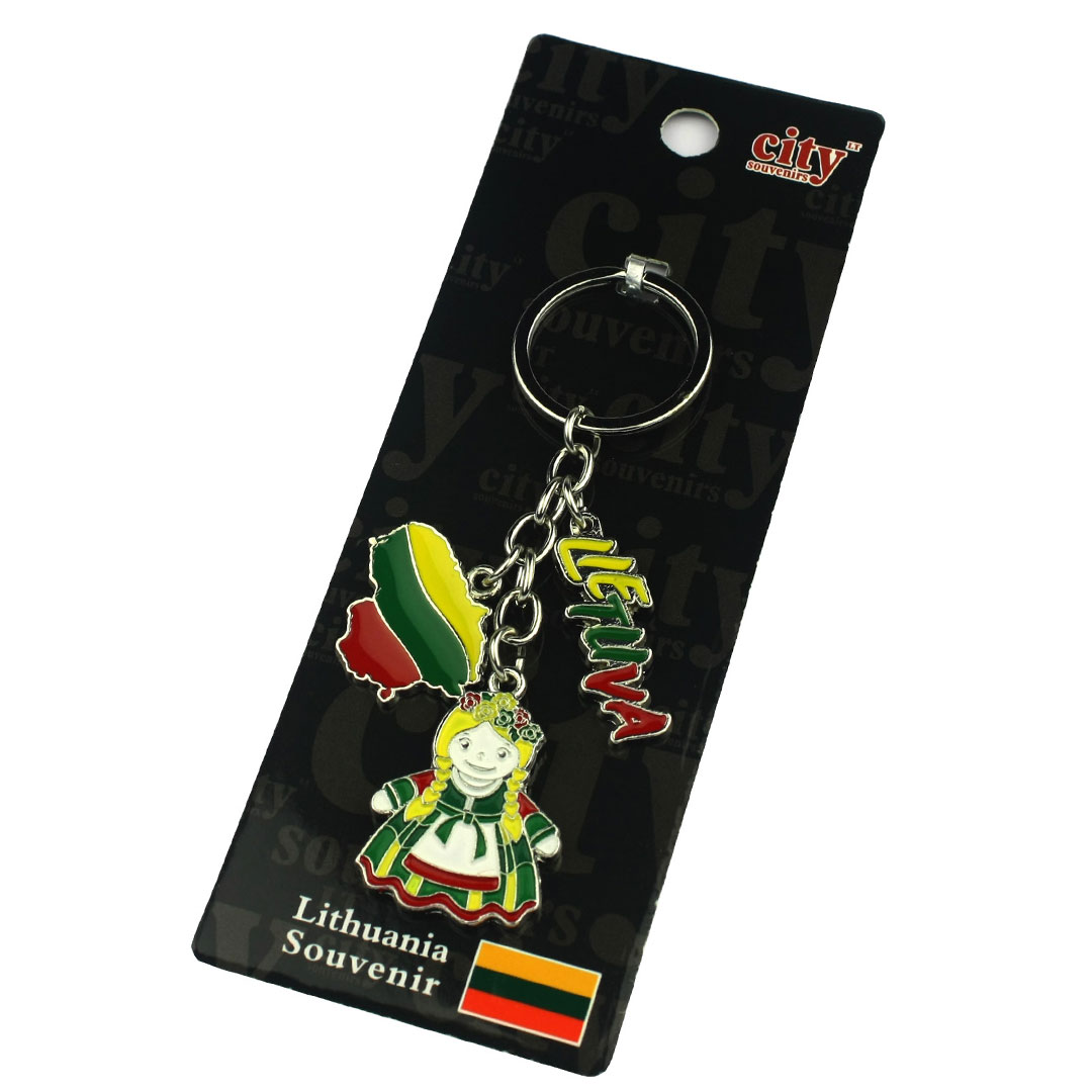 Spalvingas metalinis raktų pakabukas „Mergaitė Lietuva“ – tai smagus ir žaismingas suvenyras, perteikiantis tautinius simbolius. Jį sudaro trys simboliniai elementai: Lietuvos kontūras su trispalve, užrašas „Lietuva“ bei mergaitė su tautiniais drabužiais. Pakabukas su tvirtu metaliniu žiedu, todėl puikiai tinka raktams, kuprinei ar kelioniniam krepšiui. Tai puiki dovana svečiui, keliautojui ar verslo partneriui, norinčiam parsivežti dalelę Lietuvos.
