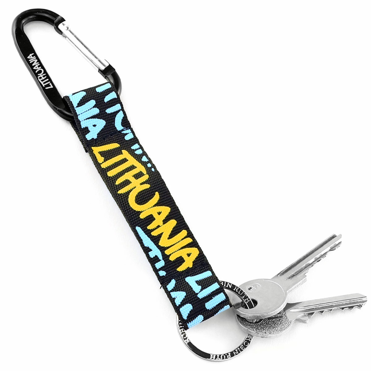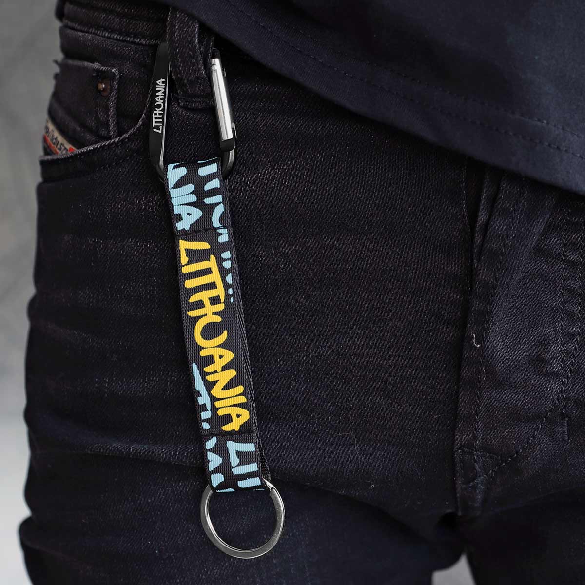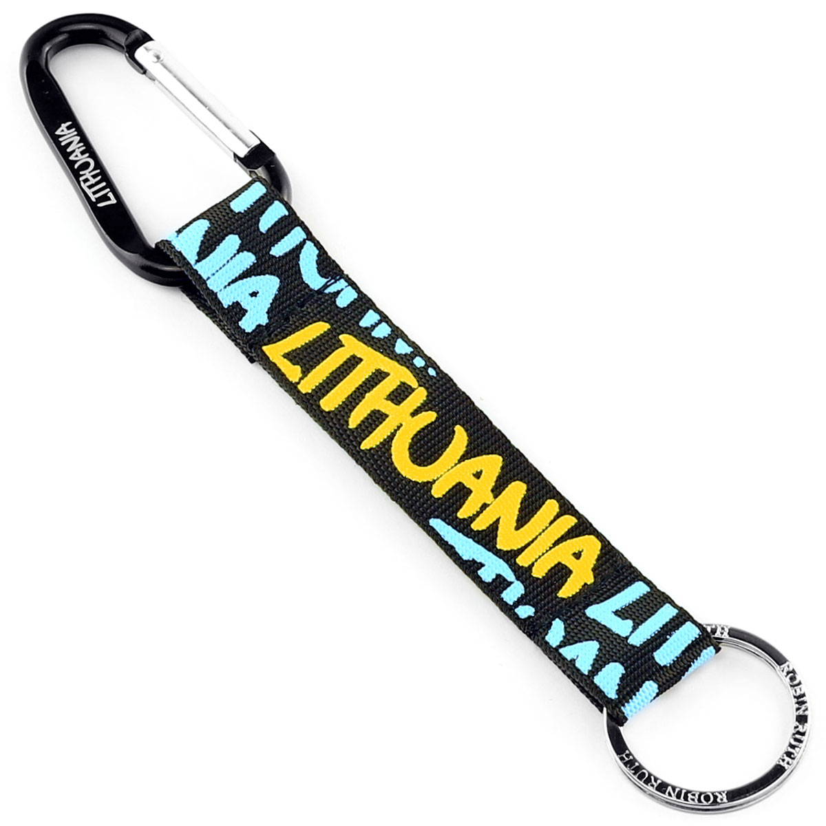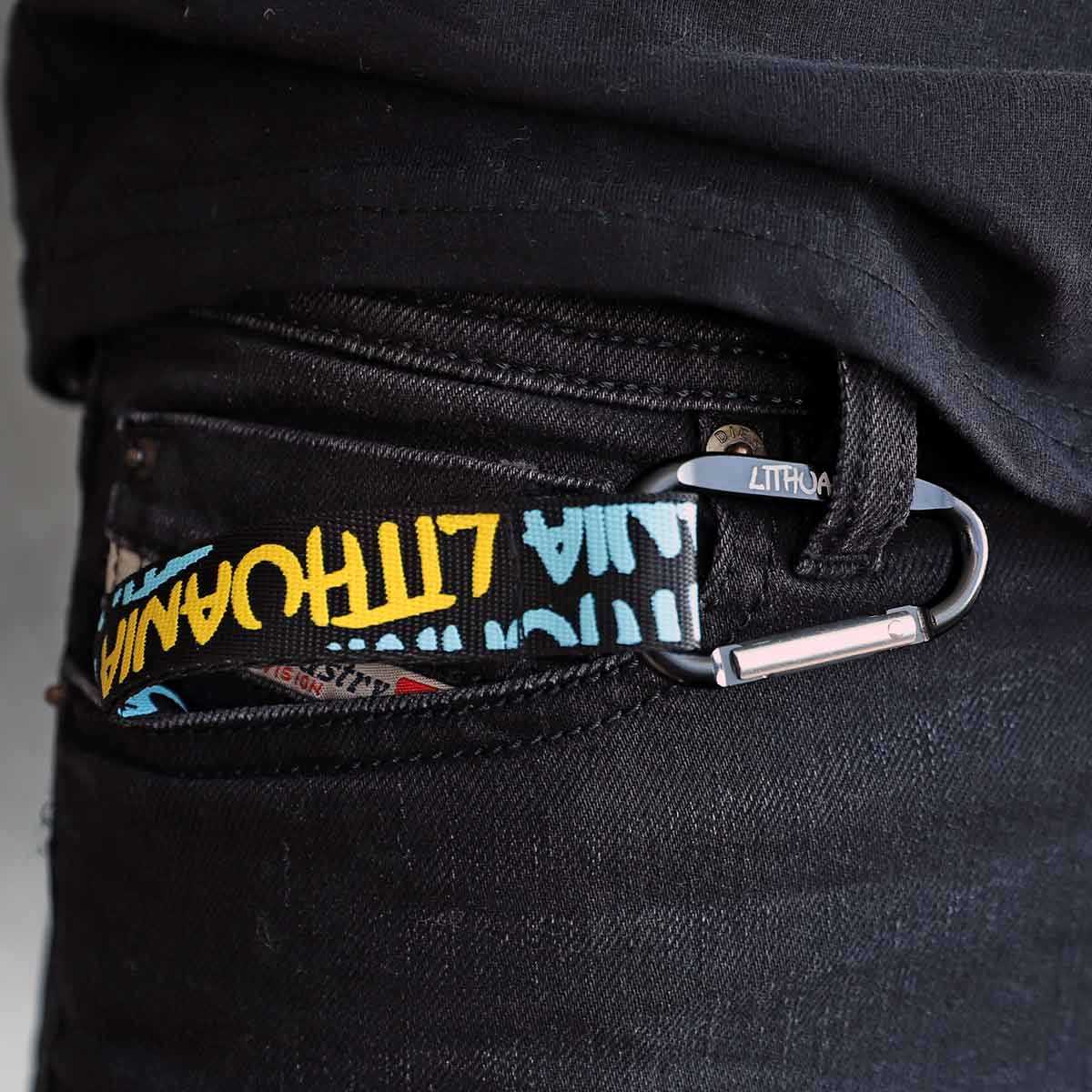 Juodas raktų pakabukas LITHUANIA su geltonu užrašu ir karabinu. Ryškus Robin Ruth aksesuaras.