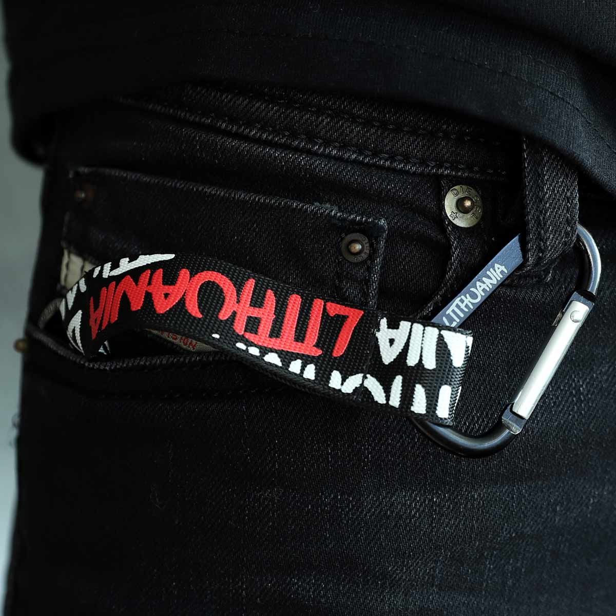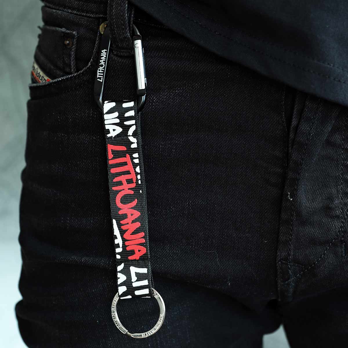 Juodas raktų pakabukas LITHUANIA su karabinu. Modernus ir patvarus Robin Ruth aksesuaras.