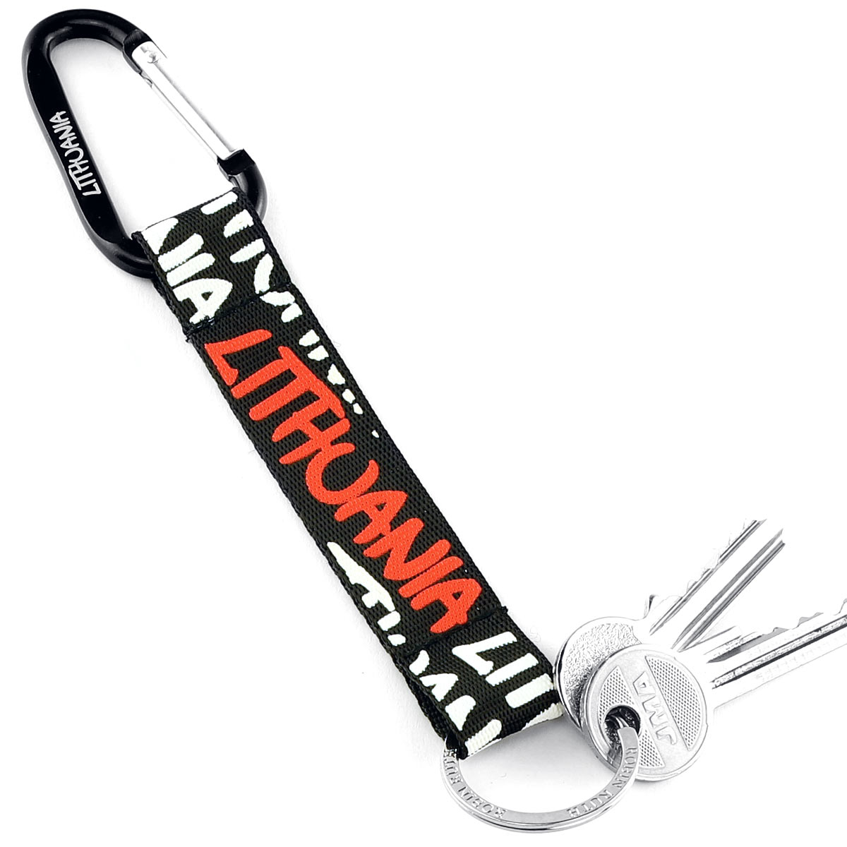 Tvirtas metalinis karabinas leidžia saugiai pritvirtinti raktus, kuprinę ar kitus daiktus, o patvari juostelė užtikrina ilgaamžiškumą net intensyviai naudojant.