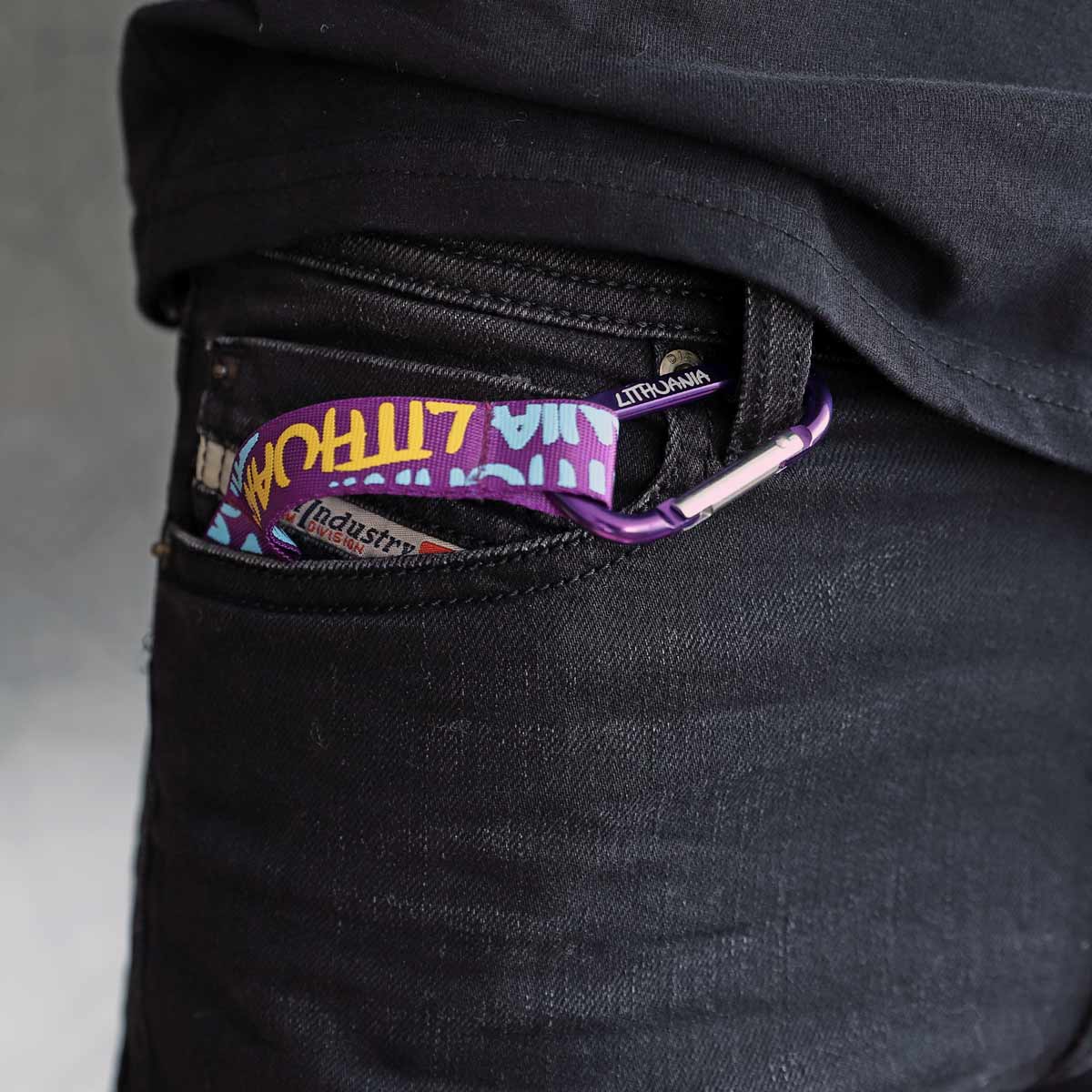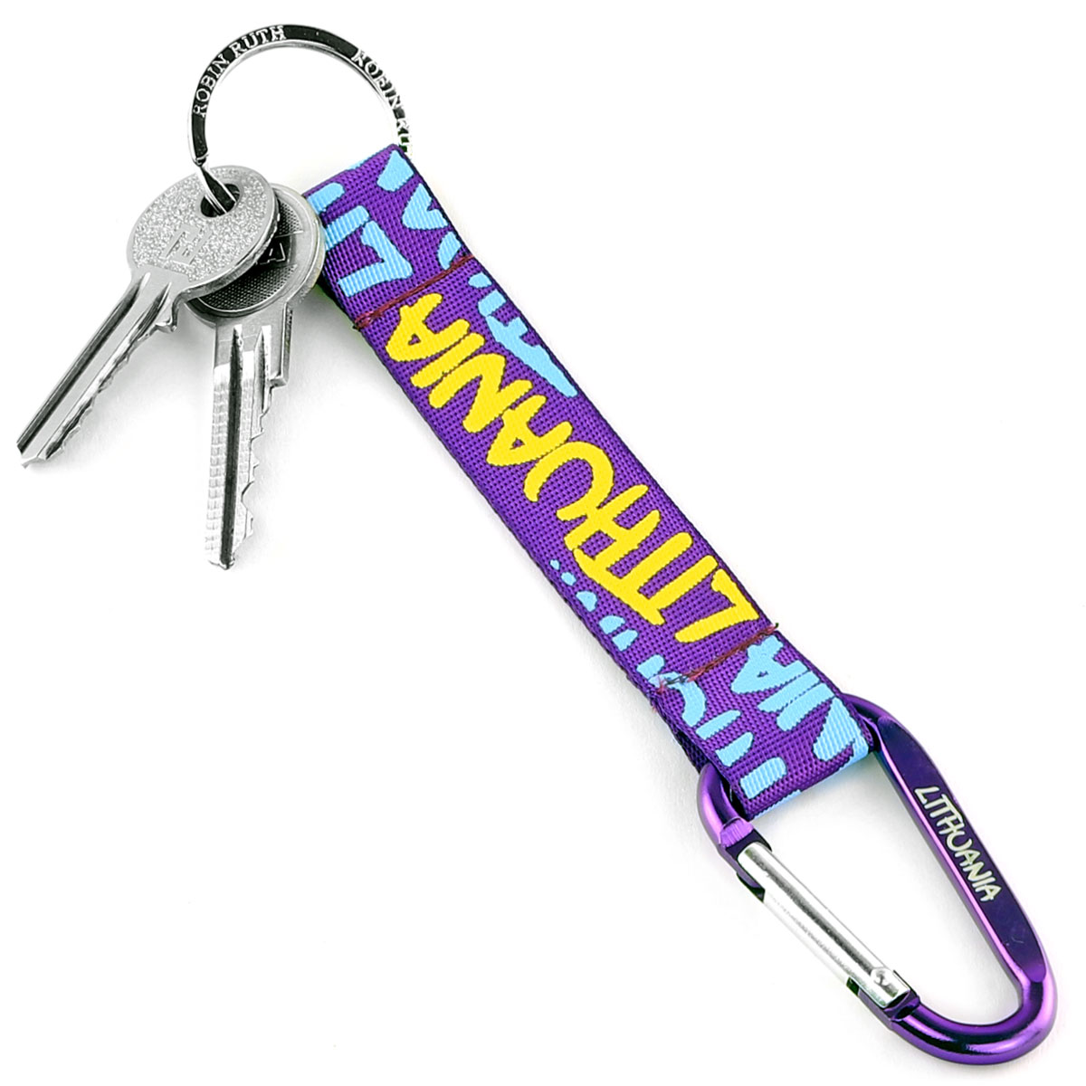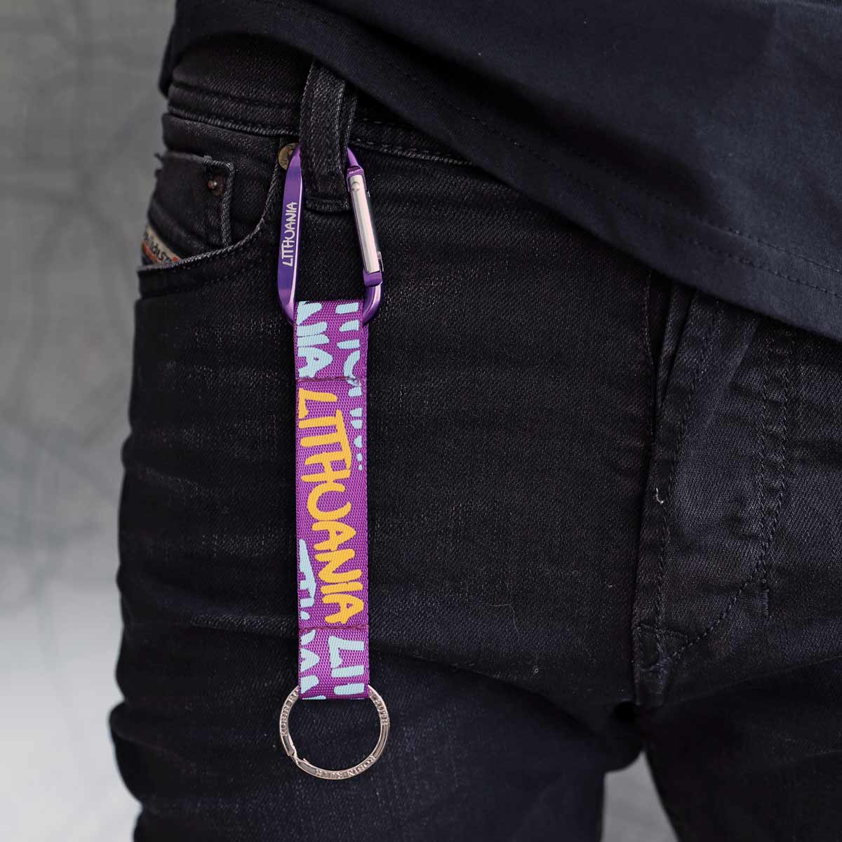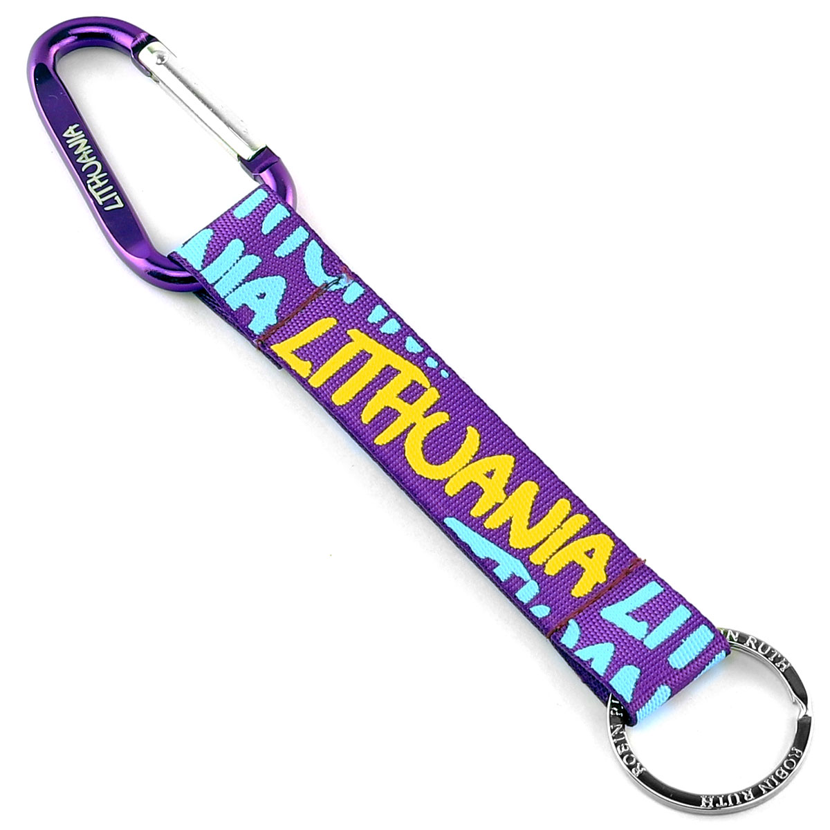 Violetinis raktų pakabukas LITHUANIA su geltonu užrašu ir karabinu. Ryškus Robin Ruth aksesuaras.