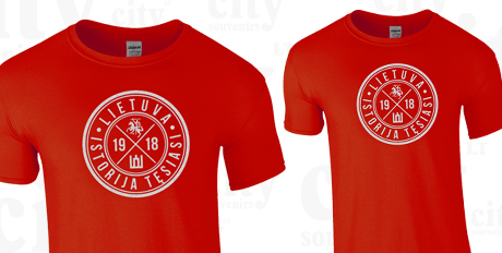 Raudoni medvilniniai marškinėliai trumpomis rankovėmis ‘Lietuva 1918 Istoriją Tęsiasi’ , pasiūti iš 100% medvilnės, apvaliu kaklu su iškilia, barchatine floko spauda.