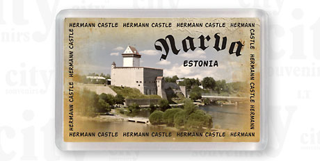 Suvenyras, plastikinis rėmelis – magnetukas su Narva vaizdu.