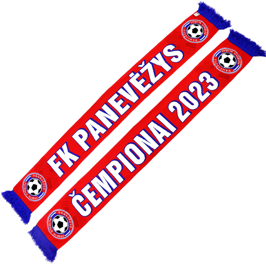 Oficialus FK „Panevėžys“ šalikas su logotipu ir užrašu „Čempionai 2023“ – puiki dovana ir sirgalių atributas.