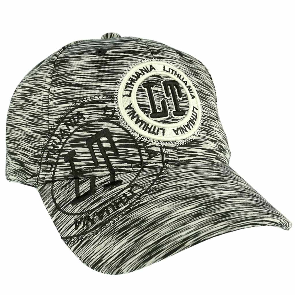 Sportinė kepurė su snapeliu „Lithuania LT“, pilkai juodo rašto, su siuvinėtu logotipu ir reguliuojamu Velcro užsegimu.