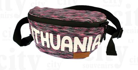 Fuksija atspalvio sportinio stiliaus piniginė ant juosmens su užrašu Lithuania. Priekinė piniginės dalis užsegama dviejų krypčių užtrauktuku. Yra galinė kišenėlė užsegama užtrauktuku. Tai kompanijos Robin Ruth produktas.