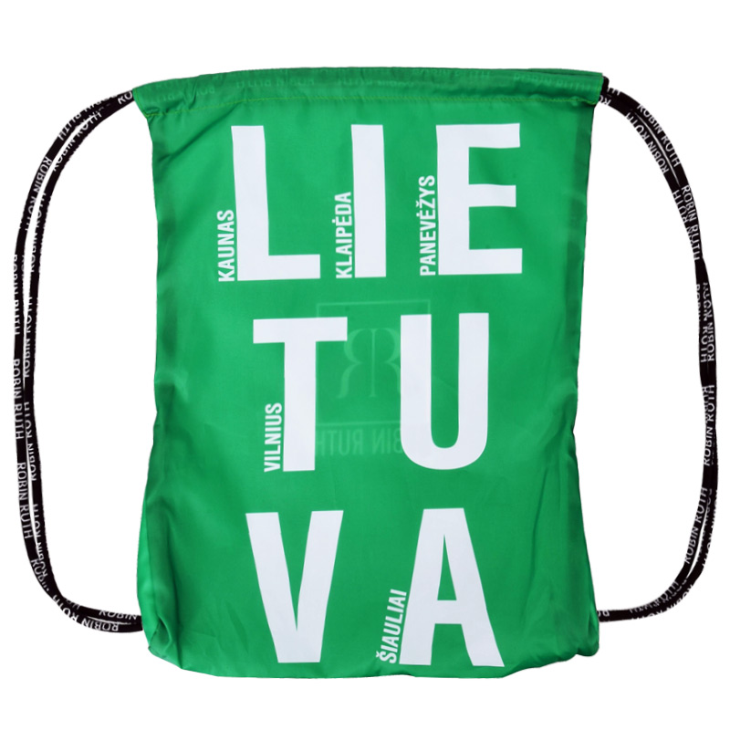 Sportinis maišelis–kuprinė su „LIETUVA“ ir didžiųjų miestų pavadinimais – stilingas, patogus ir lengvas aksesuaras kasdienai ar kelionei.